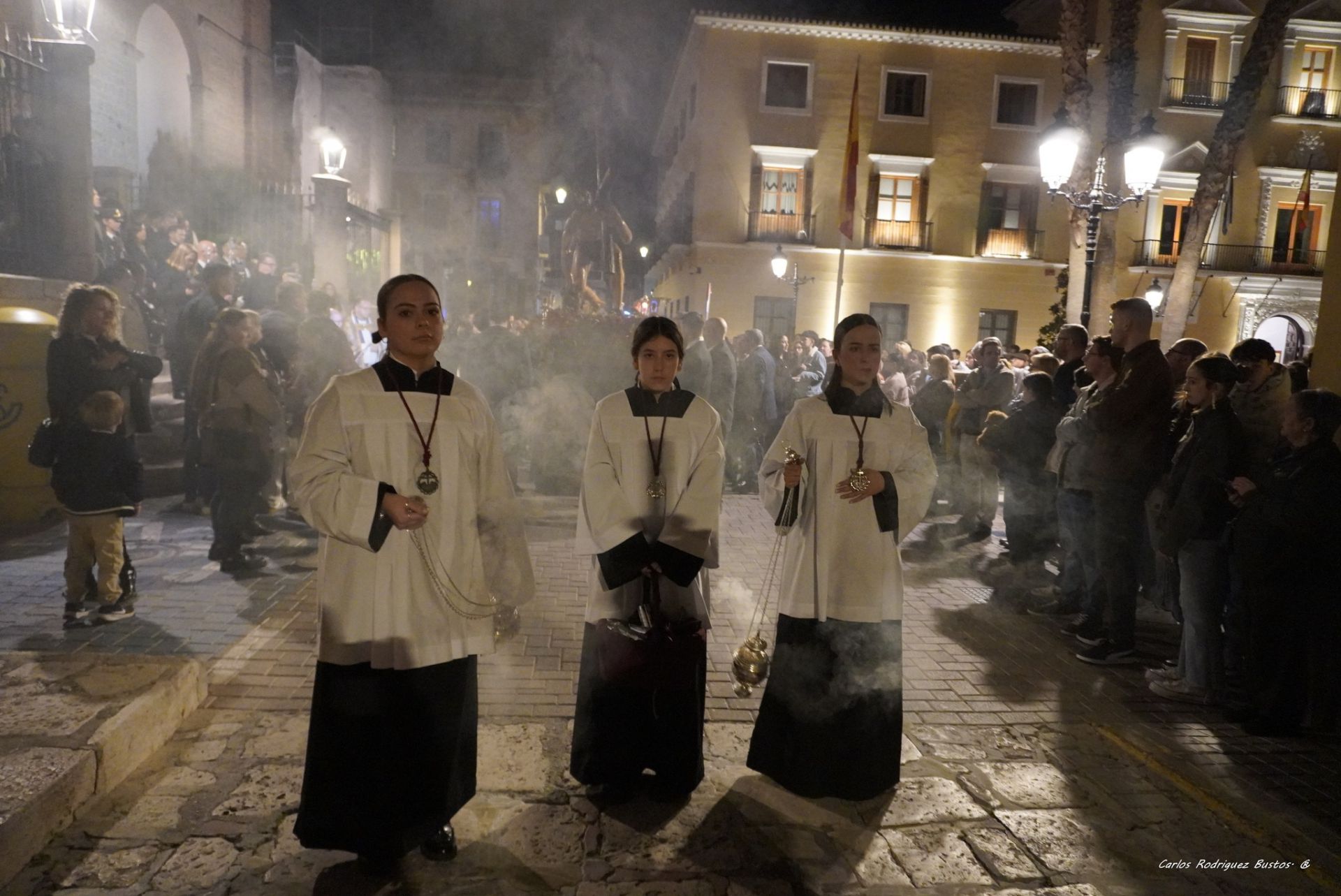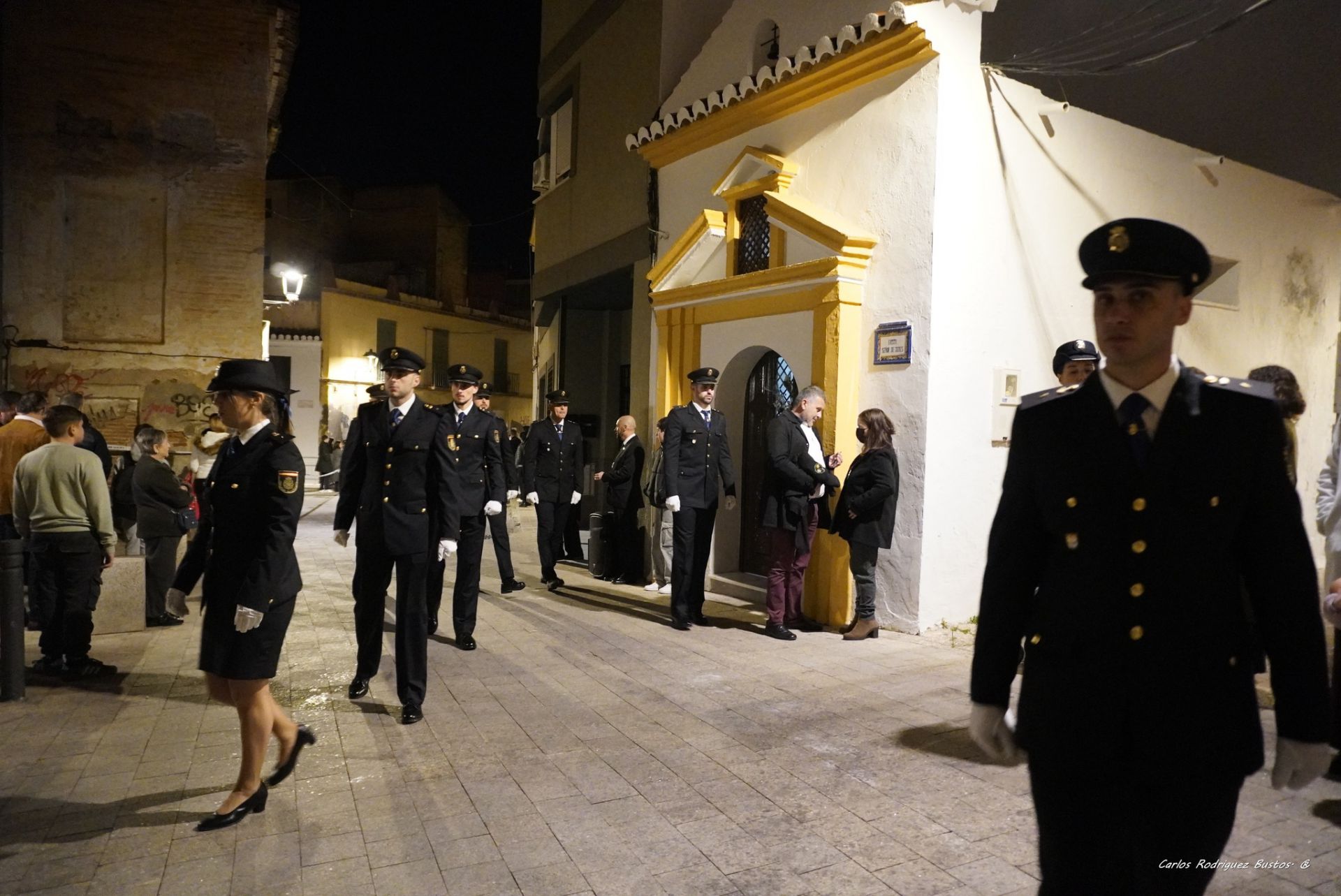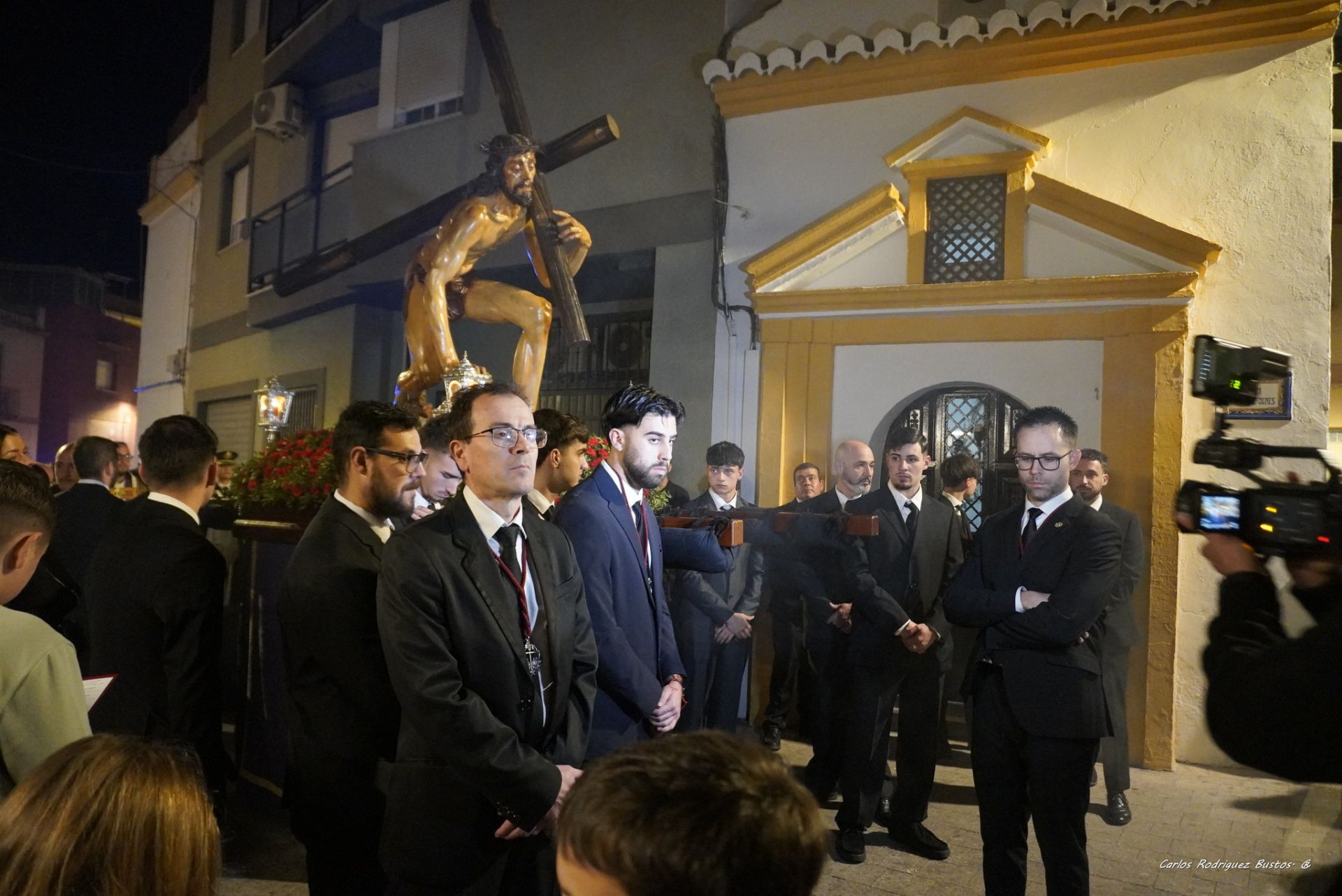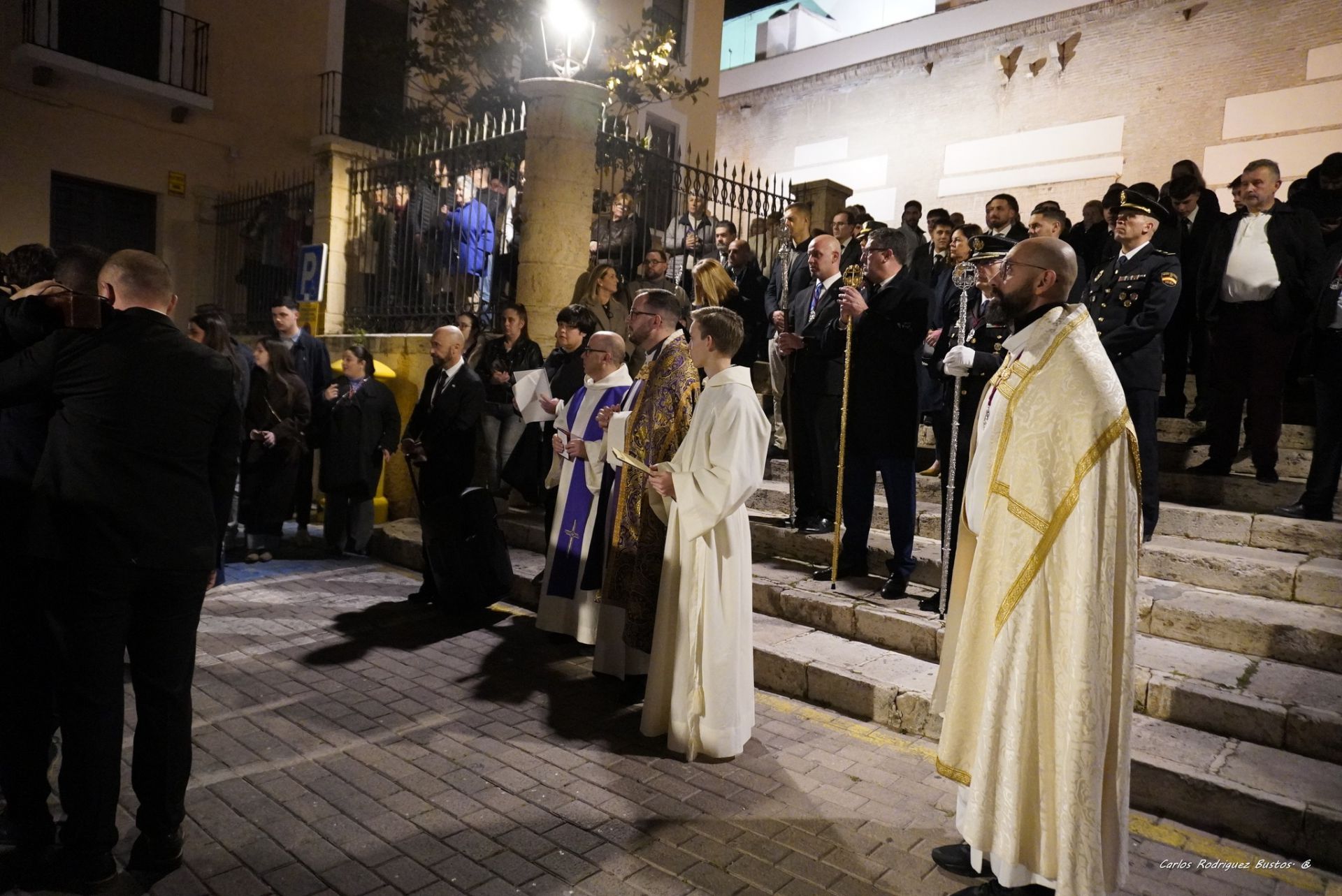 Concluida la santa misa, se ha dado lugar a los preparativos del vía crucis que han culminado con la apertura de la puerta lateral del crucero a las 20:55 h, momento en el que ha hecho su aparición la cruz parroquial escoltada por dos faroles de frente de procesión. Paralelamente, en el lateral del atrio, se disponía en perfecta formación el Cuerpo Nacional de Policía con su guion representativo, a la espera de que iniciara su marcha la imagen de Jesús de Pasión, que este año conmemora el 40ª aniversario de su hechura, razón por la cual preside este santo vía crucis.