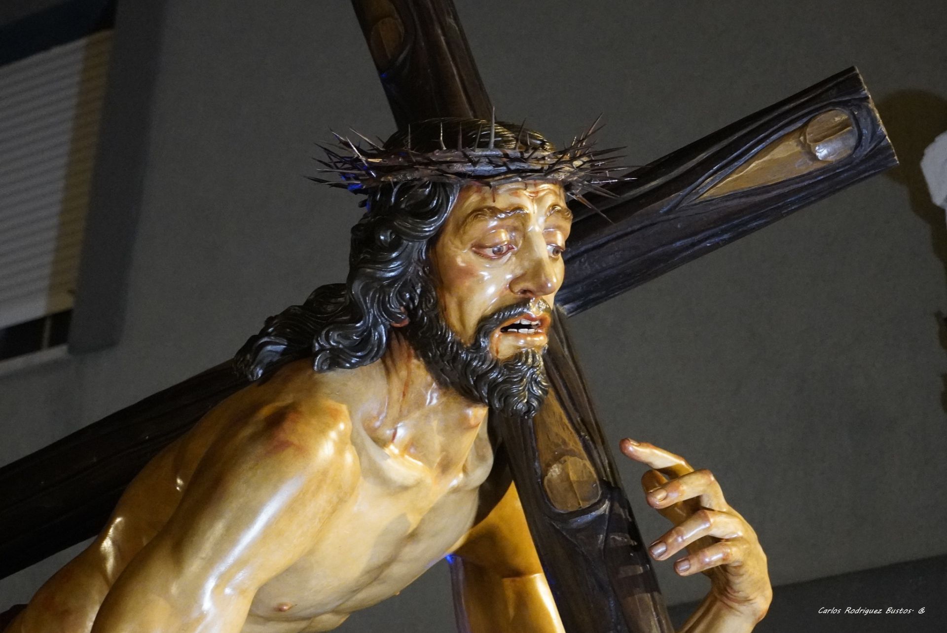 Impresionante, sin duda, la imagen de Jesús de Pasión, que ha sido presentada a los fieles tal y como fue concebida y que representa al “Maestro” en una de sus caídas. La efigie es obra del escultor granadino Antonio Barbero Gor y fue concluida a finales del mes de febrero de 1986, con lo que se cumplen exactamente 40 años de existencia en esta salida procesional. Concretamente, el día tres de marzo, le era entregada a su hermandad y, jornadas más tarde, concretamente el día 16, era bendecida solemnemente por el entonces Arzobispo de Granada, D. José Méndez Asencio. Desde el punto de vista artístico, Nuestro Padre Jesús de Pasión sigue fielmente los rasgos tipológicos que caracterizan la obra de Antonio Barbero Gor. Es una imagen de grandes dimensiones, superior incluso a tamaño natural y ha sido tallada en madera de pino de Flandes. Le representa caído, sujeto por la mano derecha a un risco elevado y por el mismo pie a una peña de menor altura. Ambos elementos actúan de soporte a la impresionante figura de Cristo que parece cobrar vida propia. Le muestra desnudo, aspecto que el artista ha cuidado en extremo, figurando con aspecto corpulento y, en cierto modo, atlético dado el tratamiento de la musculatura en ambas extremidades y torso. Particular atención merece la disposición de su mano derecha, en postura forzada y en tensión para simular el esfuerzo sobrehumano que realiza el Nazareno para intentar levantarse. La imagen tan solo aparece cubierta con un pequeño paño de pureza que está anudado a su cadera derecha mediante un cordel natural.